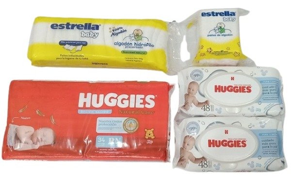 Contiene 1 Huggies RN x34 - 2 Huggies toallitas RN X48 - 1 Estrella baby Algodón precortado x100 - 1 Estrella Baby paños x40